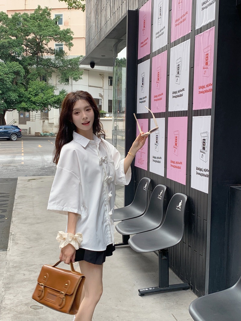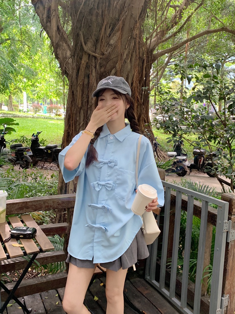 ボウタイ半袖シャツ女2025夏新ミニデザイン感ポロシャツ