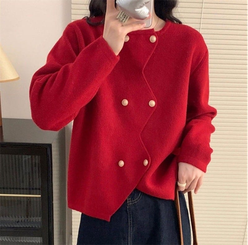 人気なリプニット 秋冬の新作ゆるふわニットカーディガン女性コートニッチデザイン不規則なデザイン感のダブルブレストセータートップス