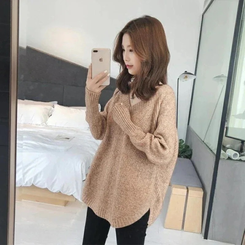 人気なリプニット だるさ風ヘッダーセーター女性ゆったり外着ニット上着長袖秋服冬厚めVネックトップス