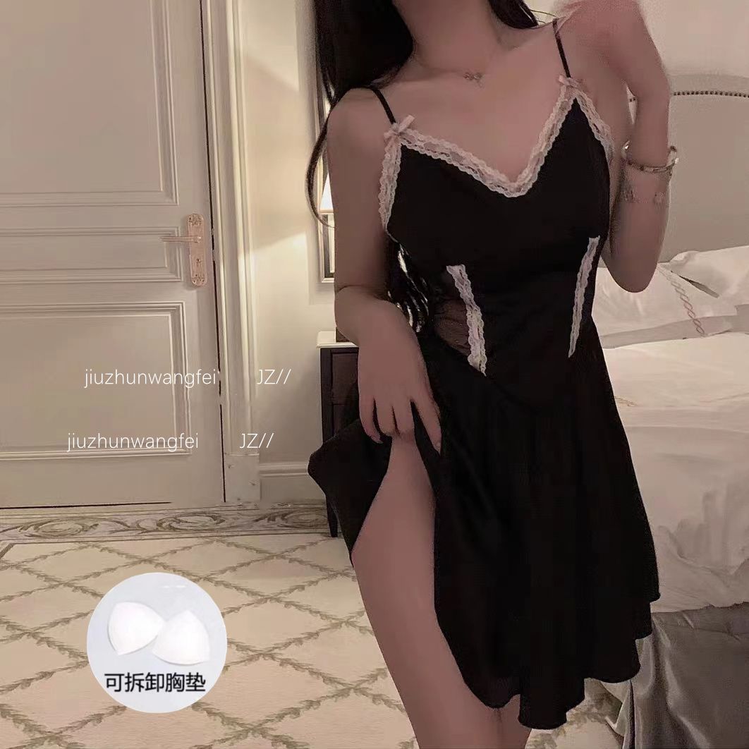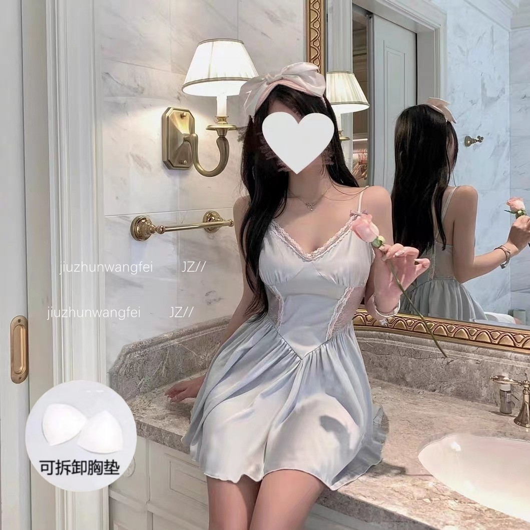 女性のための新しい夏のパジャマ純粋なセクシーなレースレースアイスシルクサスペンダーチェストパッドのナイトガウン