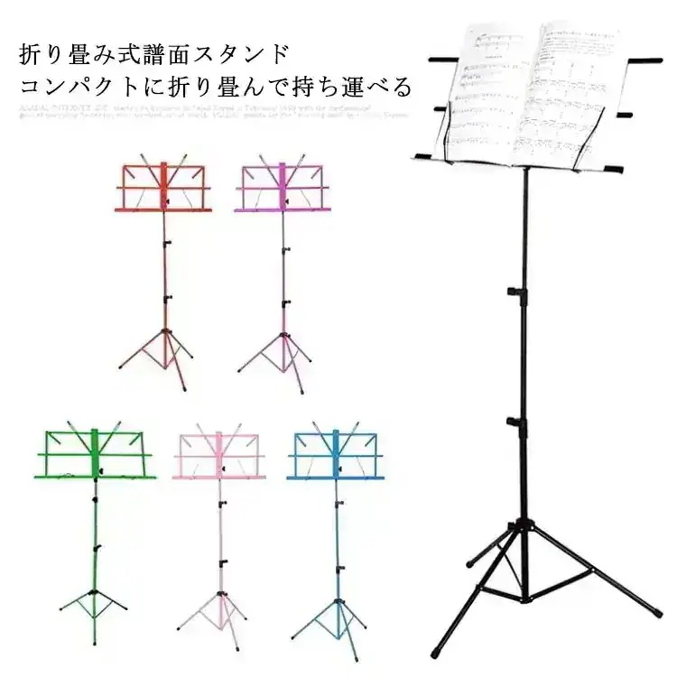譜面台 折りたたみ 軽量 コンパクト 楽譜スタンド 楽譜立て ソフトケース付 ミュージックスタンド スチール製 伸縮 角度調節可能 レッド ブルー ピンク グリーン パープル ブラック