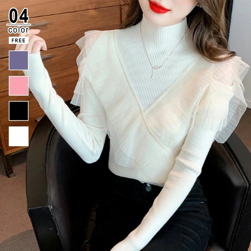 即納ニットセーターレディースックトップスフリルレースリブニットシアーシースルーラッフルカシュクール長袖セクシー肩出しプルオーバーニットセーター可愛い韓国韓国ファッション