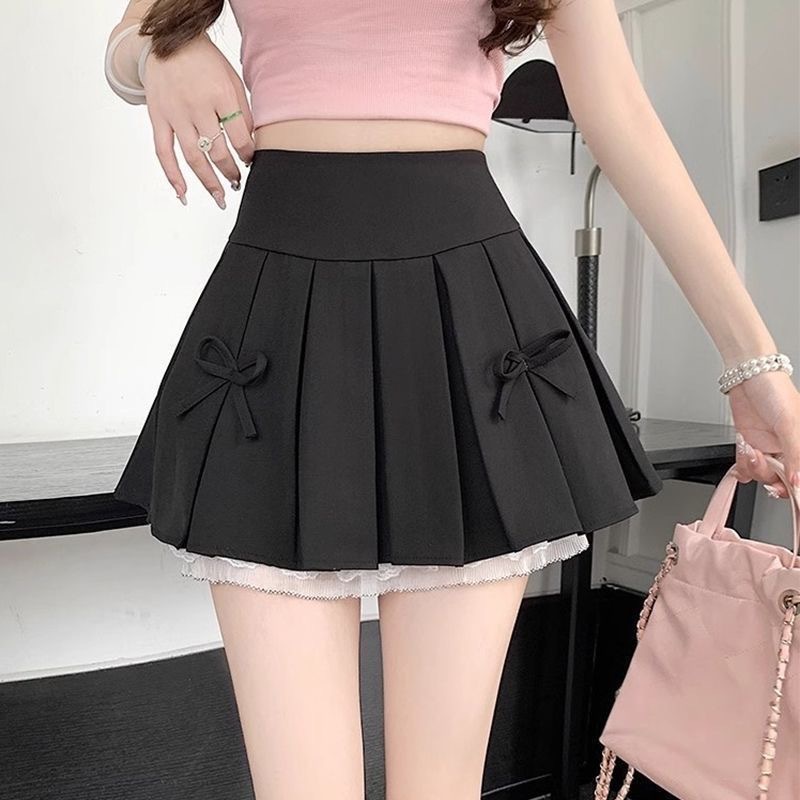 キュートカレッジAJスカートリボンレーススカートスカート2025グレーハイウエスト夏の新作プリーツスカートフレア防止誕生日プレゼント