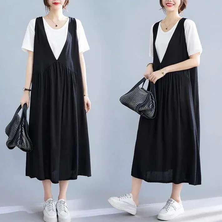 2点セット Vネック レディース 重ね着 セットアップ Tシャツ シンプル L ロングワンピース 大きいサイズ 2L今 ロング タンクワンピース 大きめ 夏 半袖 マキシ丈 春 ギャザーワンピース