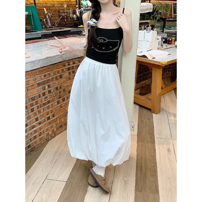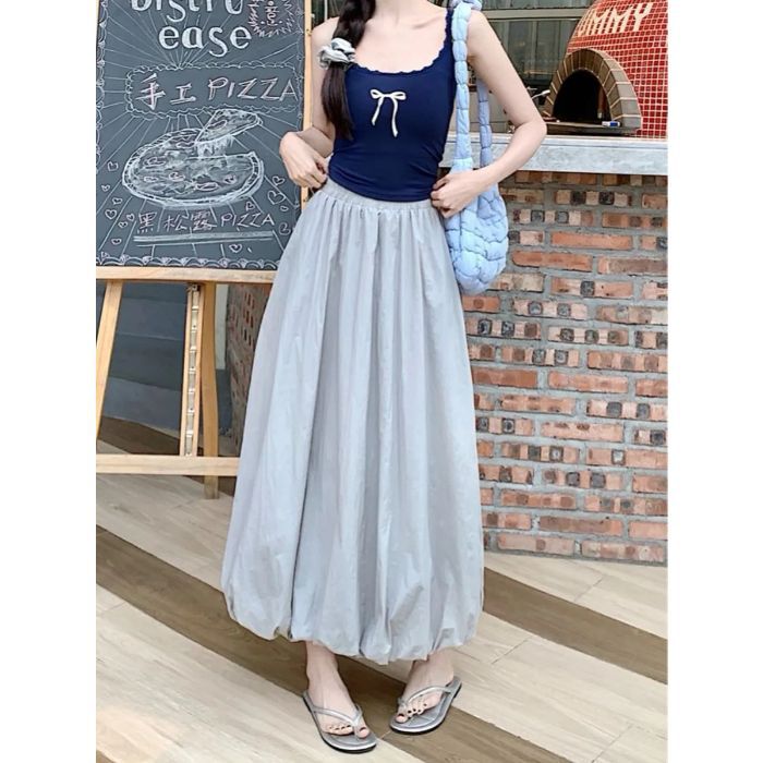 2025プリーツスカート 韓国 ポンポン つぼみスカート 春夏 ハイウエストで着やせしたデザイン感レトロな 工装ちんすこうスカート マキシスカート レディース