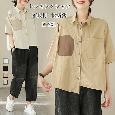 爆売れ中ドッキング シャツ 半袖 ブラウス レディース 春夏 不規則 折り襟 前開き ボタン ポケット 半袖シャツ 切り替え シャツブラウス 無地 トップス 大きいサイズ ゆったり 半袖ブラウス 体型