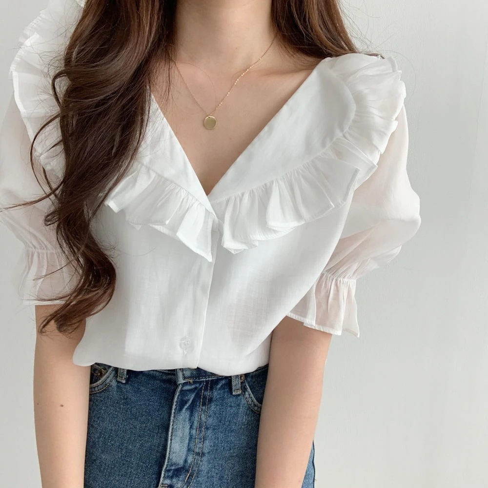 夏のデザインセンスニッチフリル齢を減らす甘いパフスリーブシフォンシャツの女性の外国の空気の通気性のトップ
