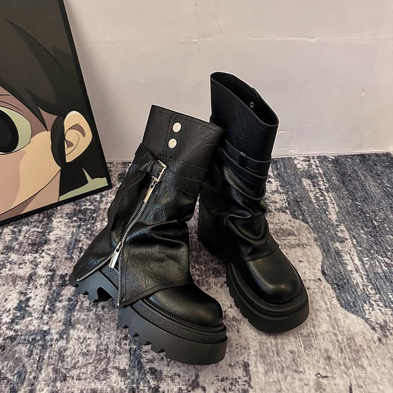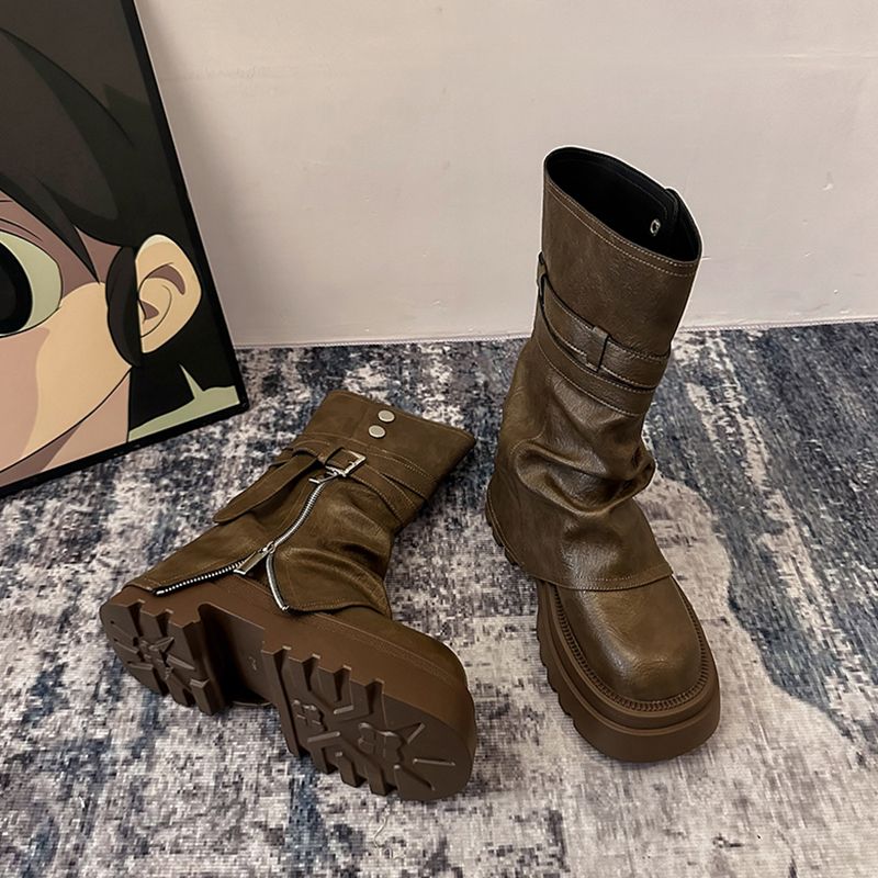 甘辛MIX風 7cm ヒール ベルト ロングブーツ 靴 美脚 脚長 色っぽ 女っぽローヒールカジュアルフェイクきれいめ 大人っぽ 上品 ウエスタンブーツ Pエコゆったり フェミニン