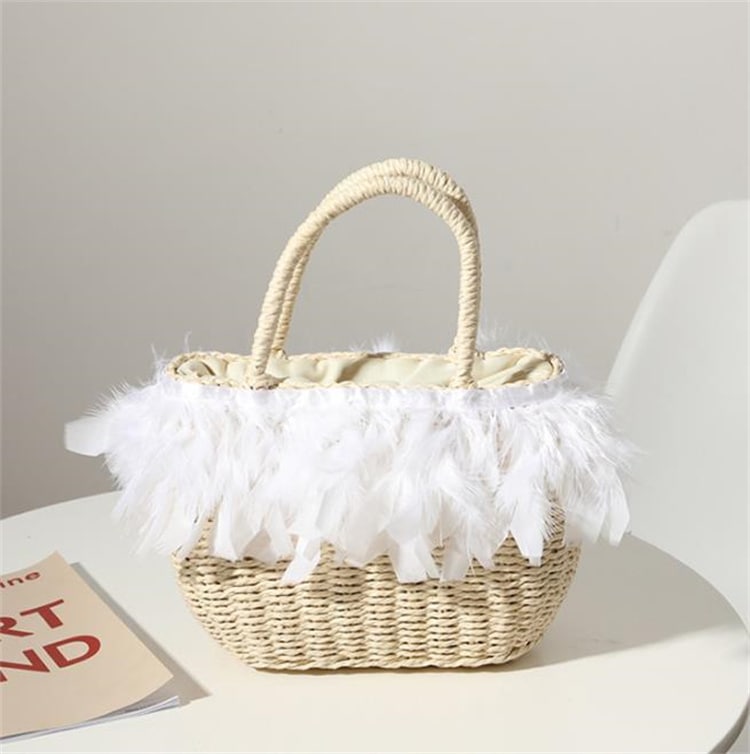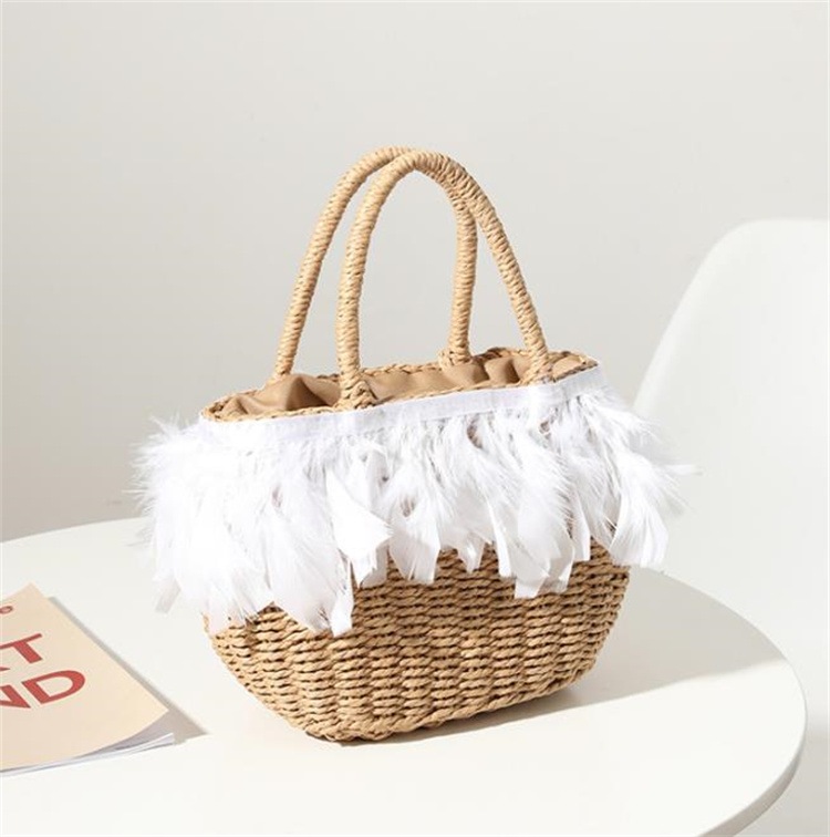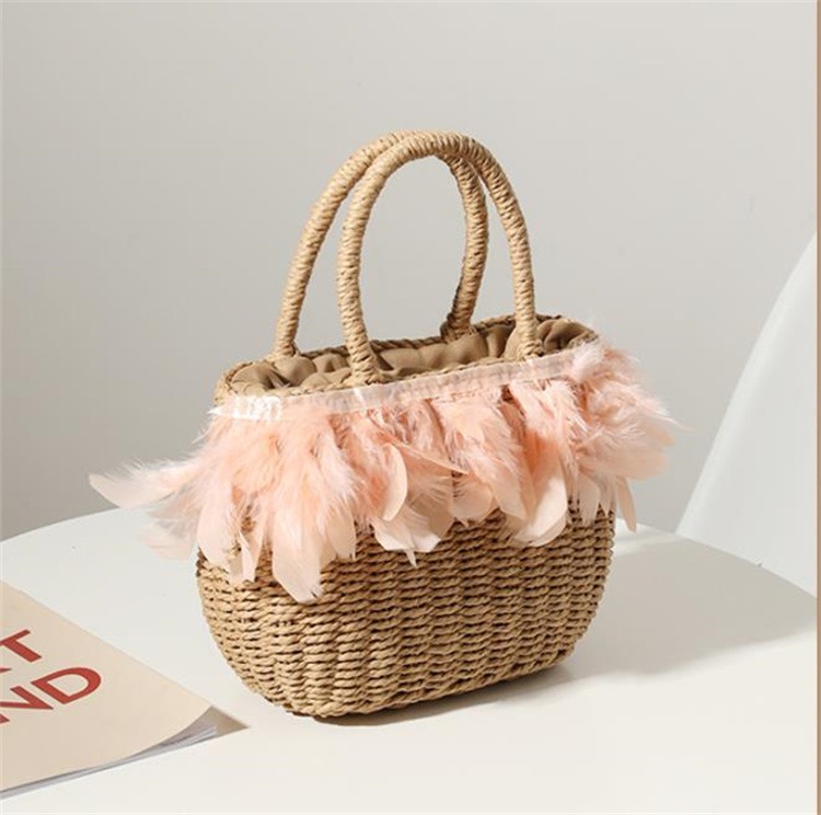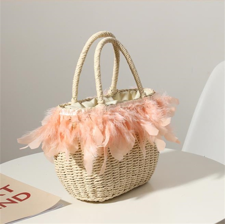 INSスタイル フェザー装飾付き ラフィアバッグ 軽量設計のビーチトート 旅行用エスニックテイスト