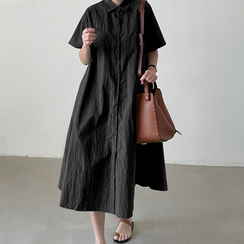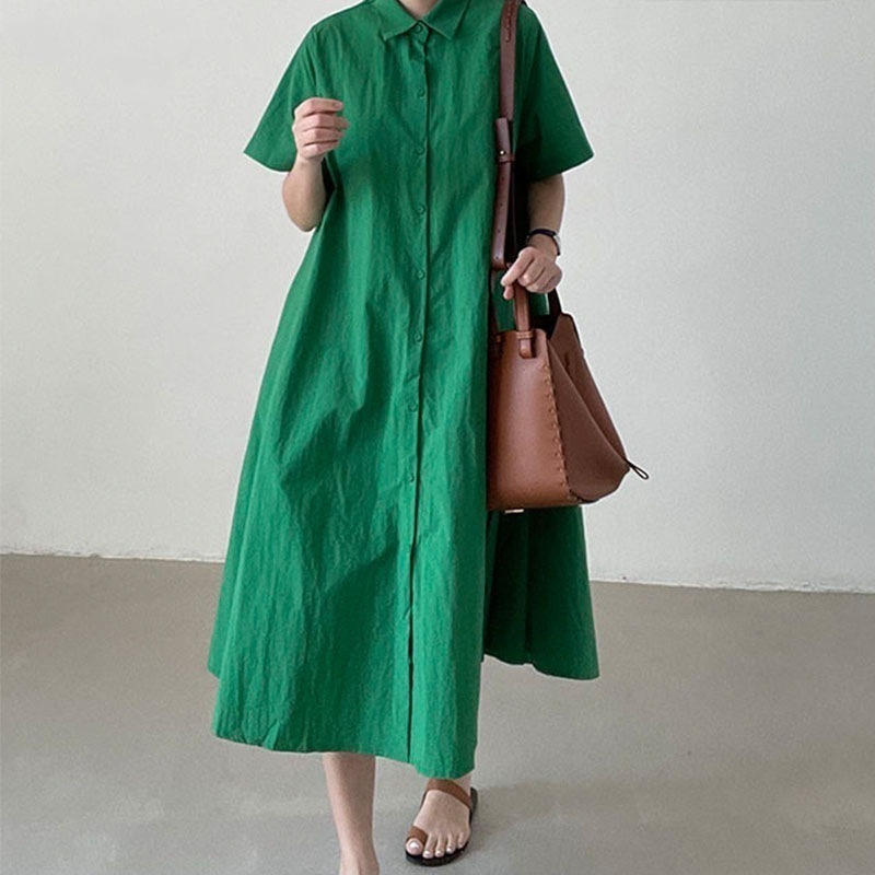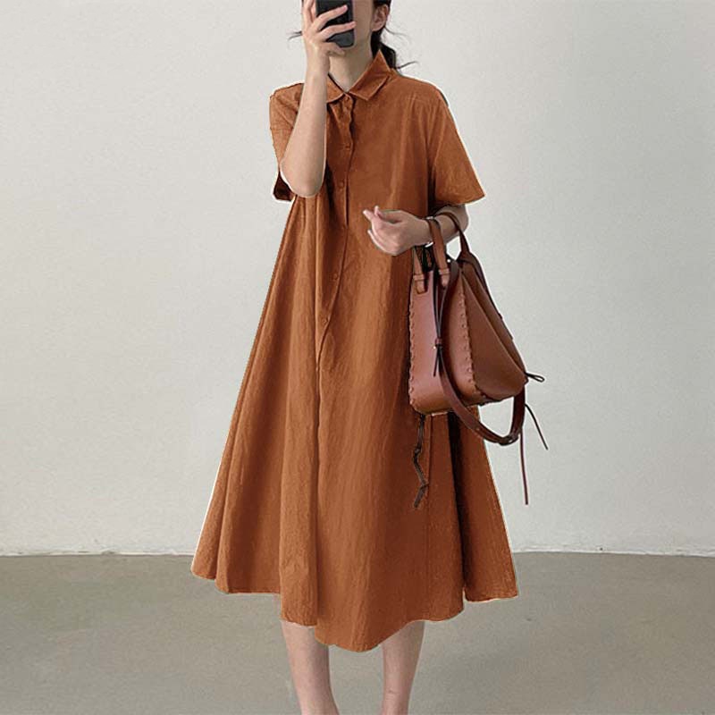 2025 新しい日本と韓国の綿とリネン無地ラペル半袖シングルブレストシンプルなルーズカジュアルロングシャツドレス