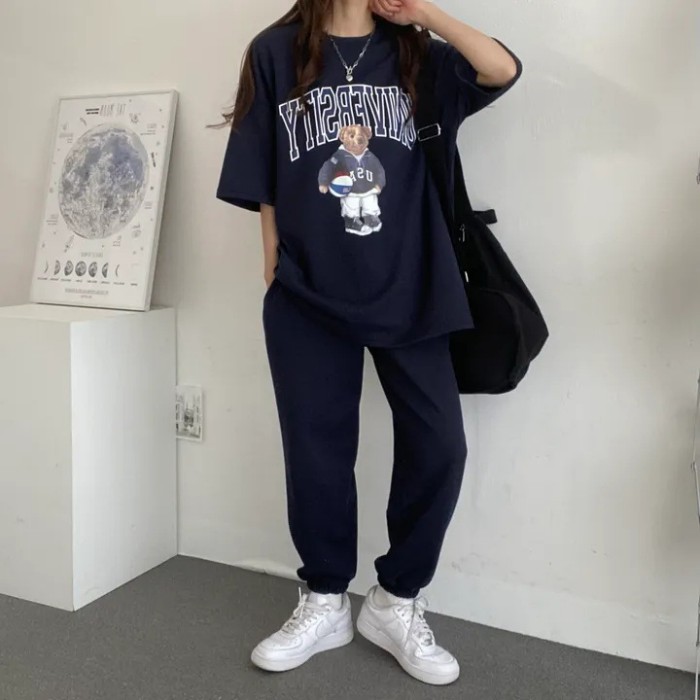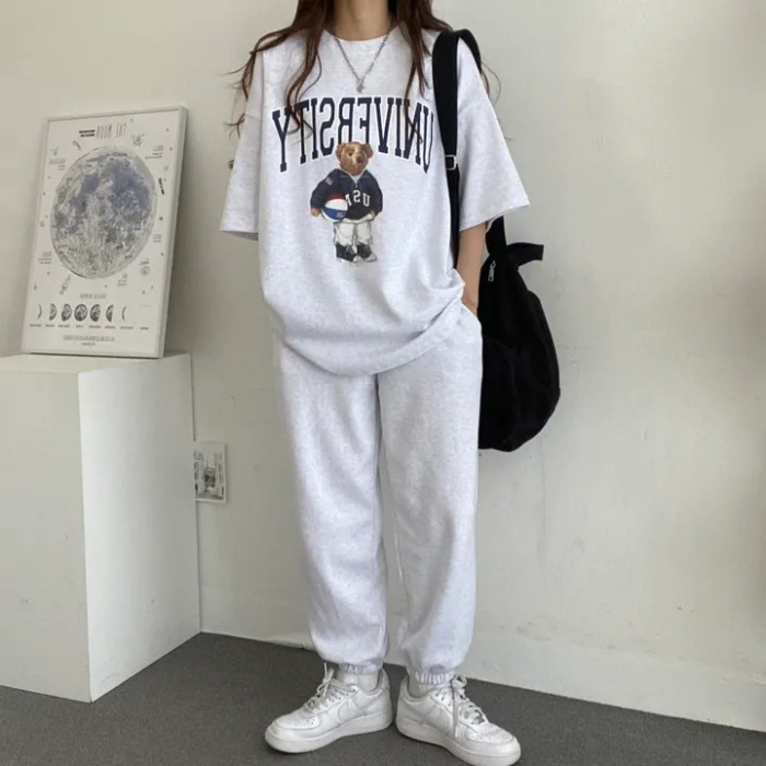 セットアップ レディース tシャツ 半袖 ロングパンツ 薄手 上下セット 春夏 クマ 可愛い カジュアル ゆったり 熊柄 大きいサイズ