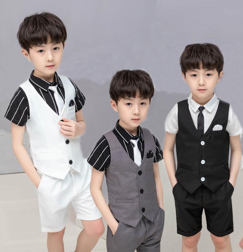 子供服 キッズ スーツセットアップ 夏用 ベスト 半ズボン 半袖ワイシャツ ネクタイ 男の子 礼服 紳士服 ストライプシャツ ジレ フォマールウェア ショートパンツセット 結婚式 発表会