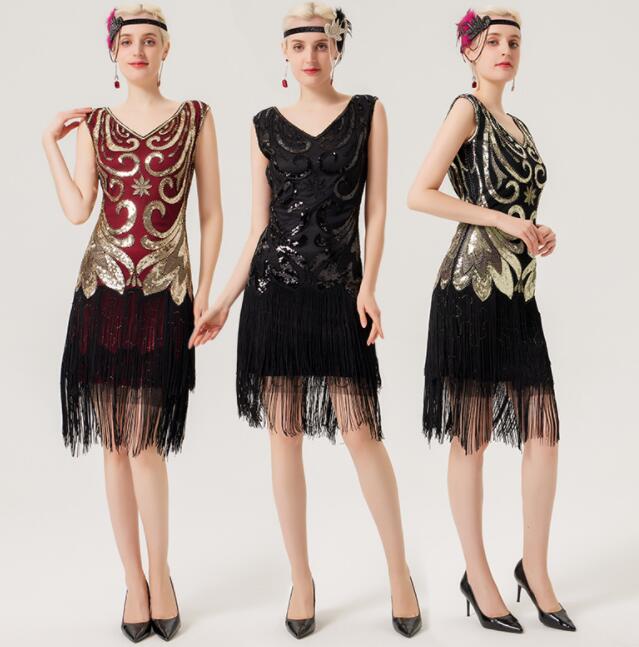 スパンコール ドレス 欧米 レトロ調 パーティー 宴会 ドレス Vネック ミモレ丈 ノースリーブ ドレス 裾フリンジ 美シルエット きらきら ダンス ワンピース レディース ル&スパンコ