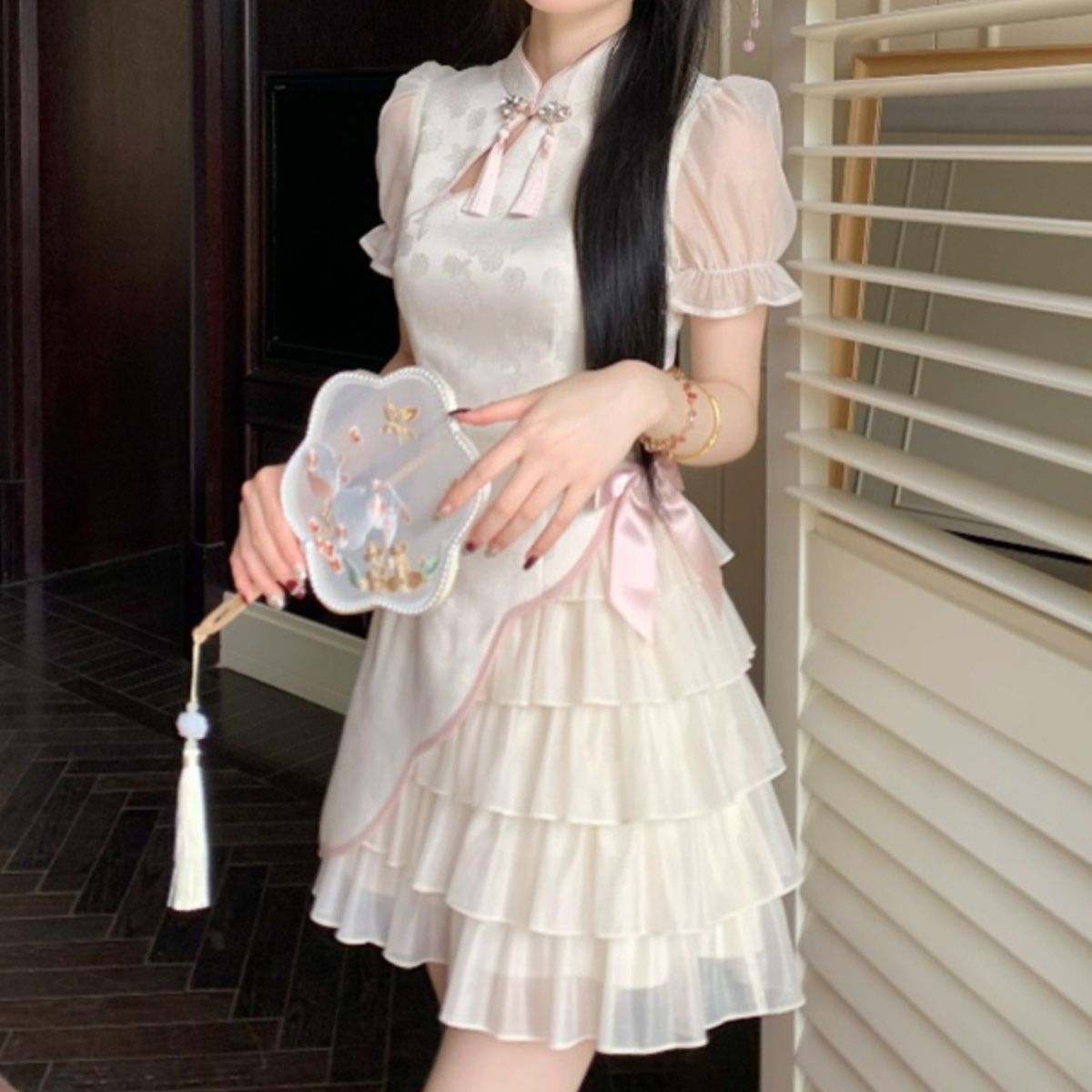 チャイナ風 リボン ジャカード ワンピース レディース 夏新しい 改良 チャイナドレス ミニワンピース パーティードレス