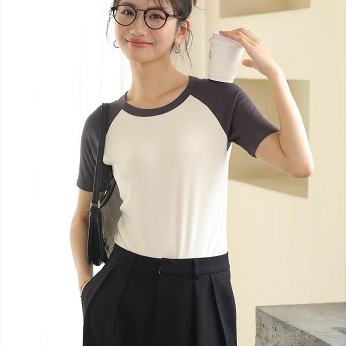 配色 ラグラン 毛羽少ない 毛玉になりにくい リブ編み ストレッチ ラグランT のびのび リブ 半袖 ツートーンーヨン Tシャツ tシャツレディーストップスTシャツカットソー