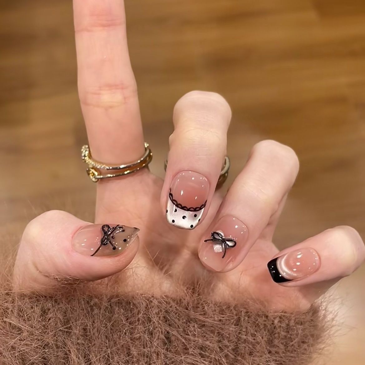 純業着用甲黒レース波点キャッツアイ氷透リボン白小短甲甘クール風