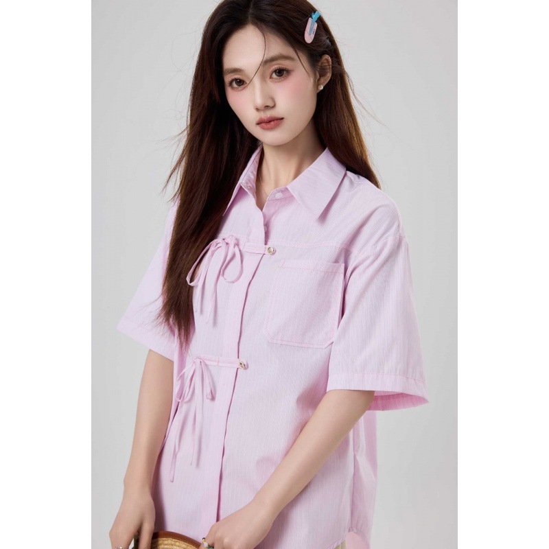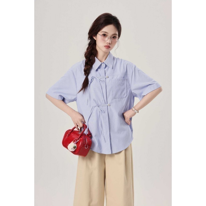 母の日商品ストライプのストラップのユニークなシャツ女性の夏の大衆のデザイン感に合わせて蝶結びのストラップの半袖シャツ