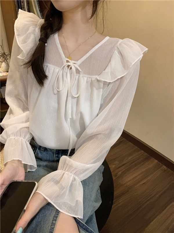 母の日系優しい風ゆるいストラップシャツ上着女装春vネックデザイン感復古長袖シャツ