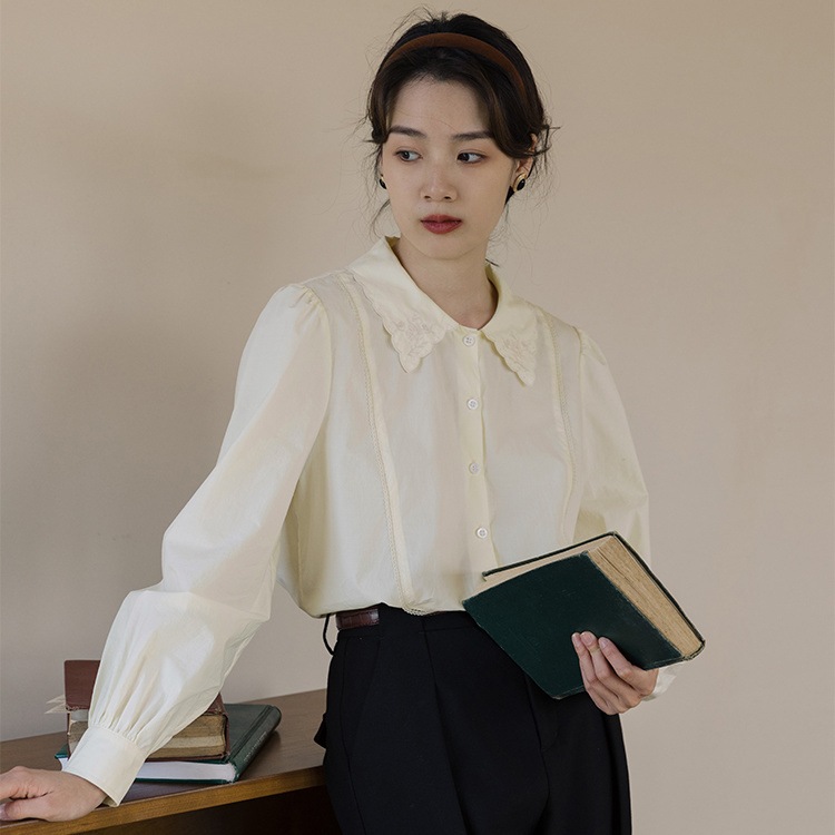 母の日商品フランスのレトロな杏のシャツの長袖の女性のゆったりしている新型の純綿の上着の学院の子供の襟の版