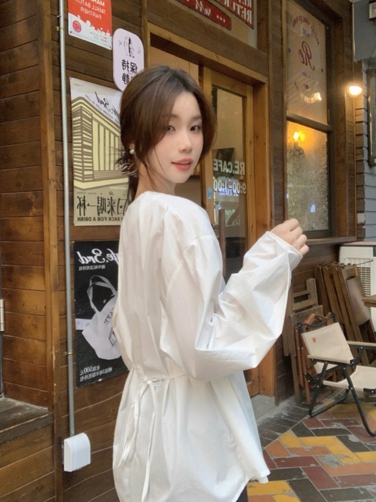 母の日系レトロvネックウエストリボン長袖シャツ女性春シンプルなフレンチデザイン感上着