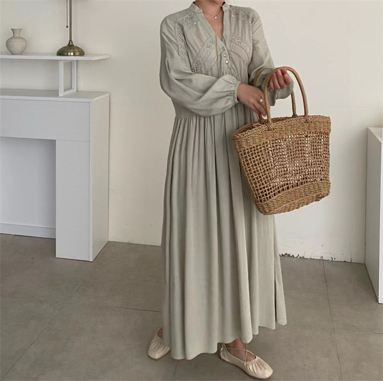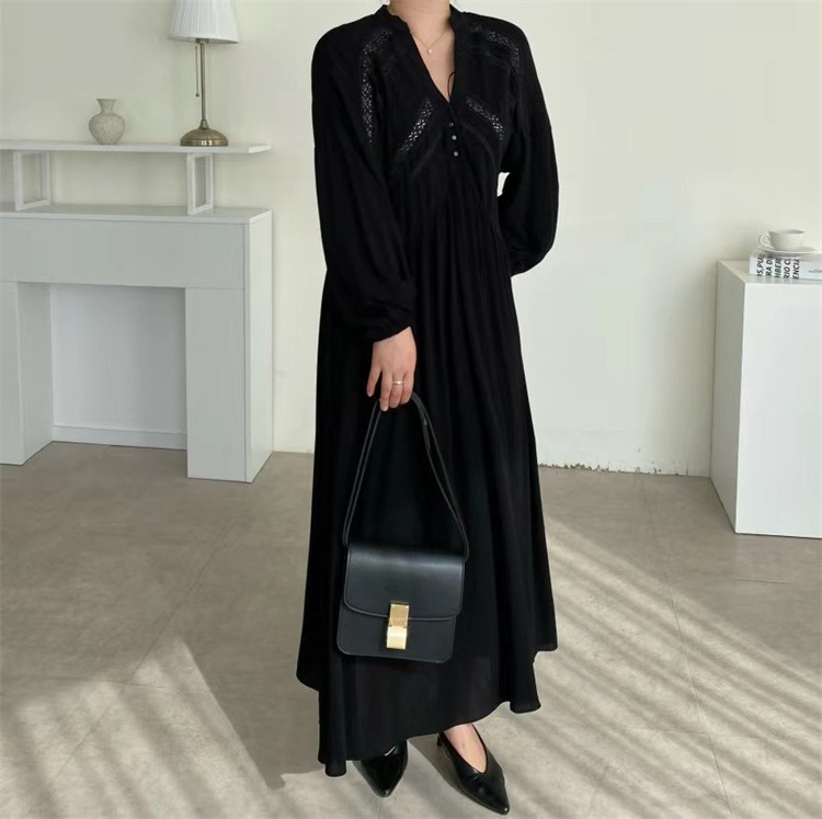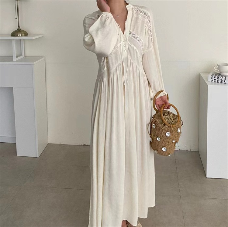 現代激安セール 透け感レースフリル拼接 ロングシルエットワンピース 長袖×ハイウエスト 大人の上品コーデ
