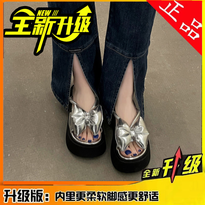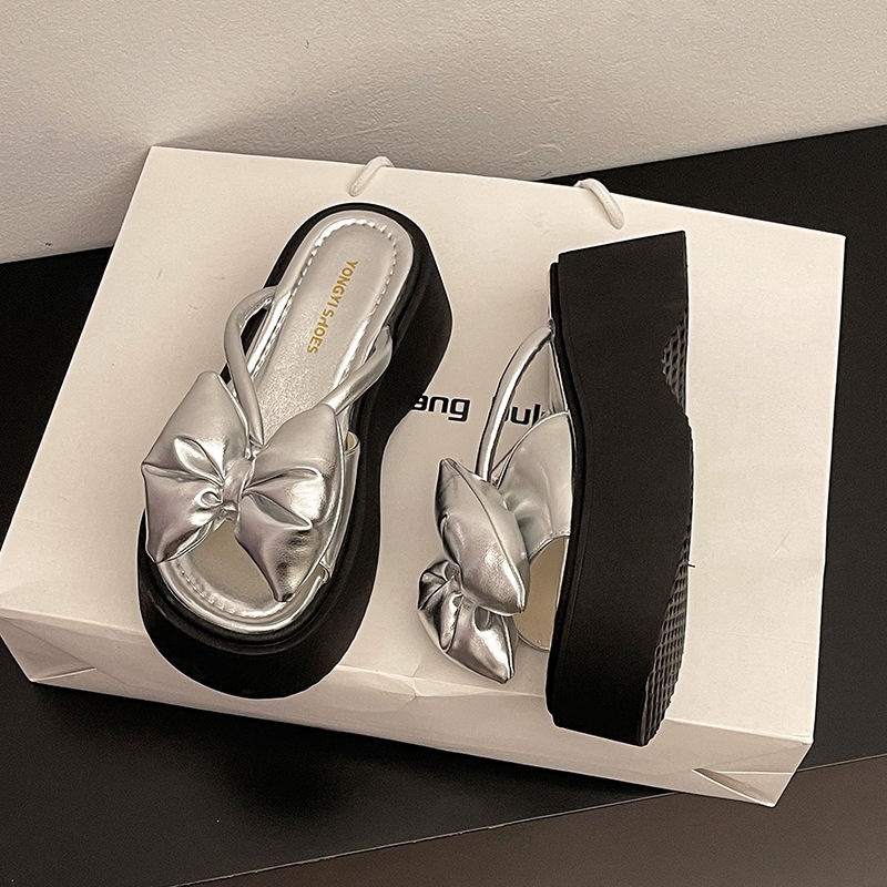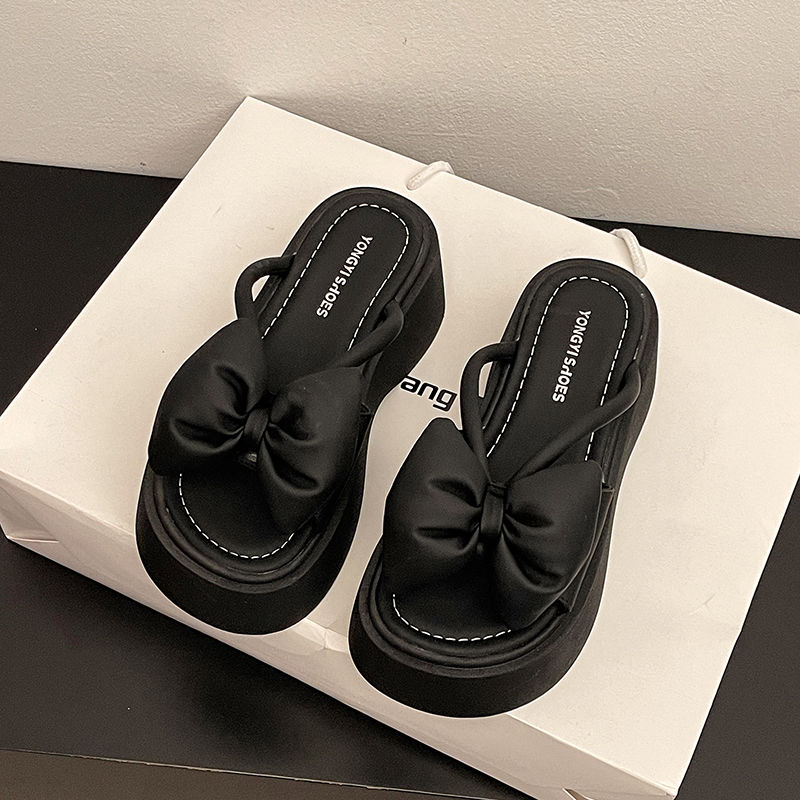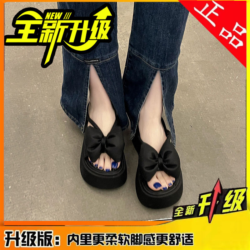 リボン厚底ハイヒールスリッパ女性夏の外履きファッション仙女風新型一字網赤涼曳