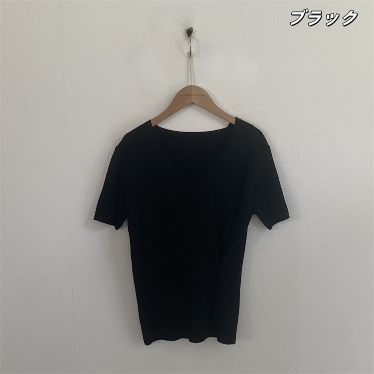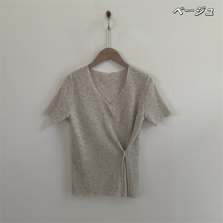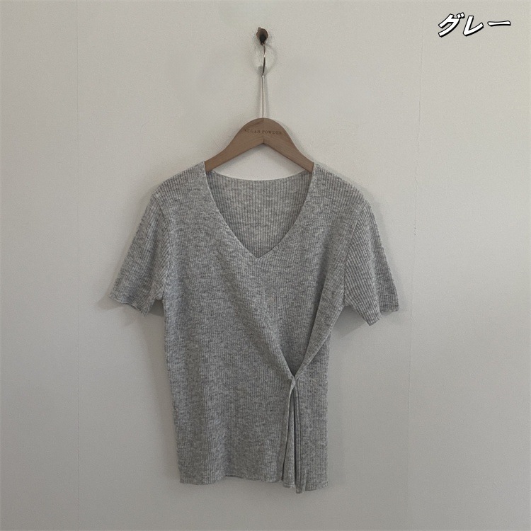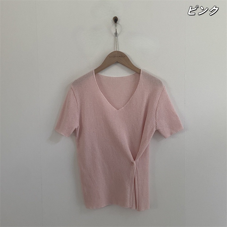 現代通勤する セレブ感漂うVネック半袖ニット ウエストマークスリットデザイン×ソリッドカラースタイリッシュトップス