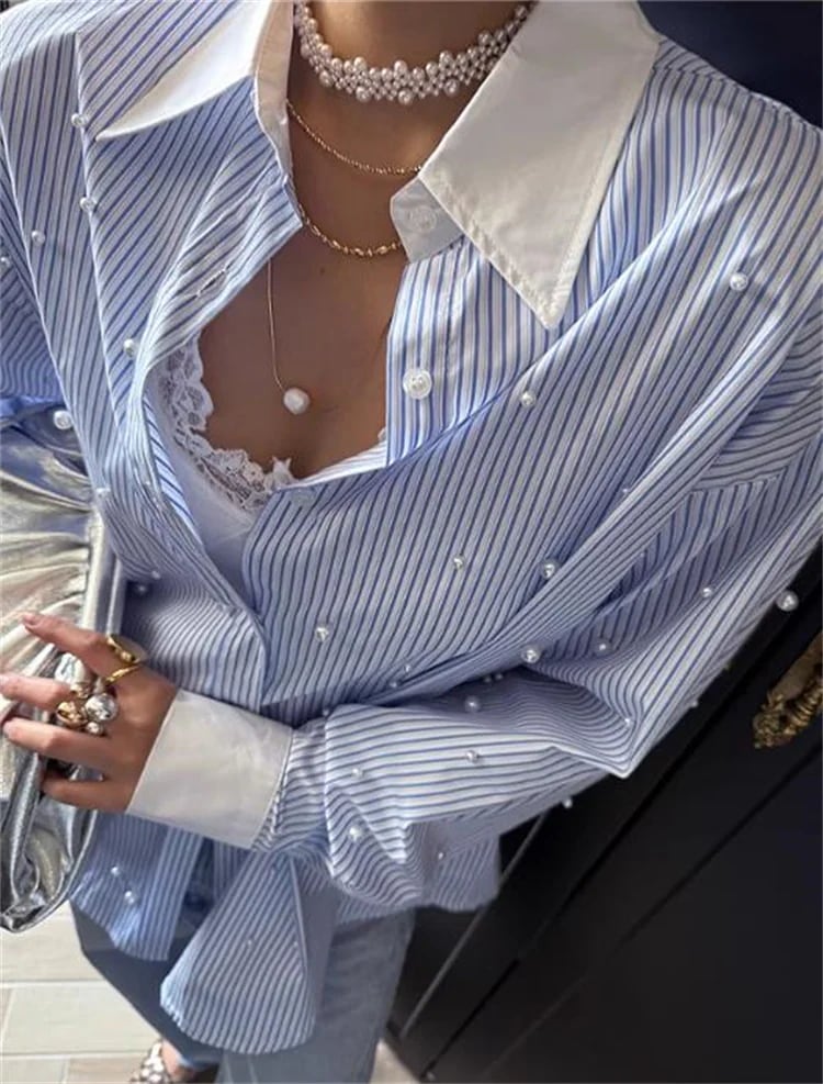 現代通勤する 2025年春トレンド 縦ラインビジュー刺繍 ゆったりデザインシャツ