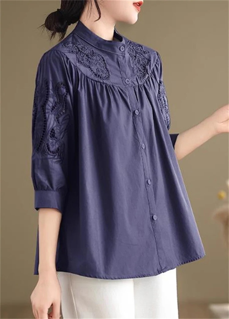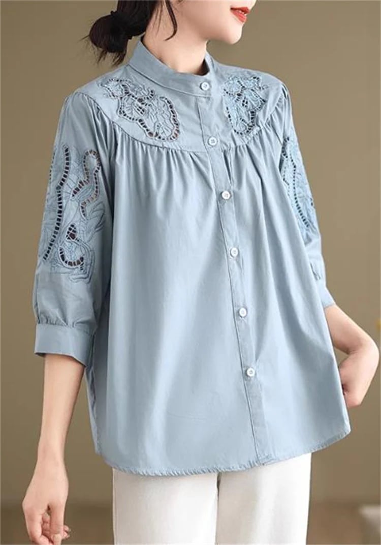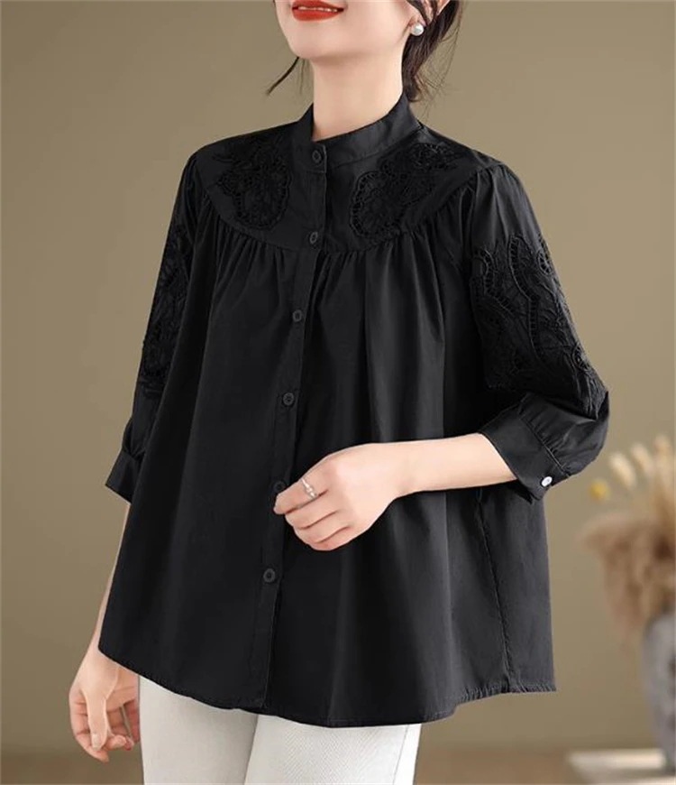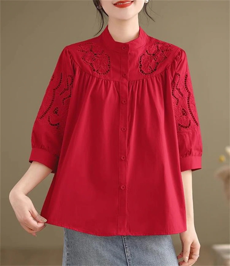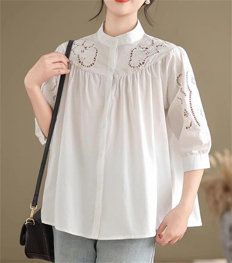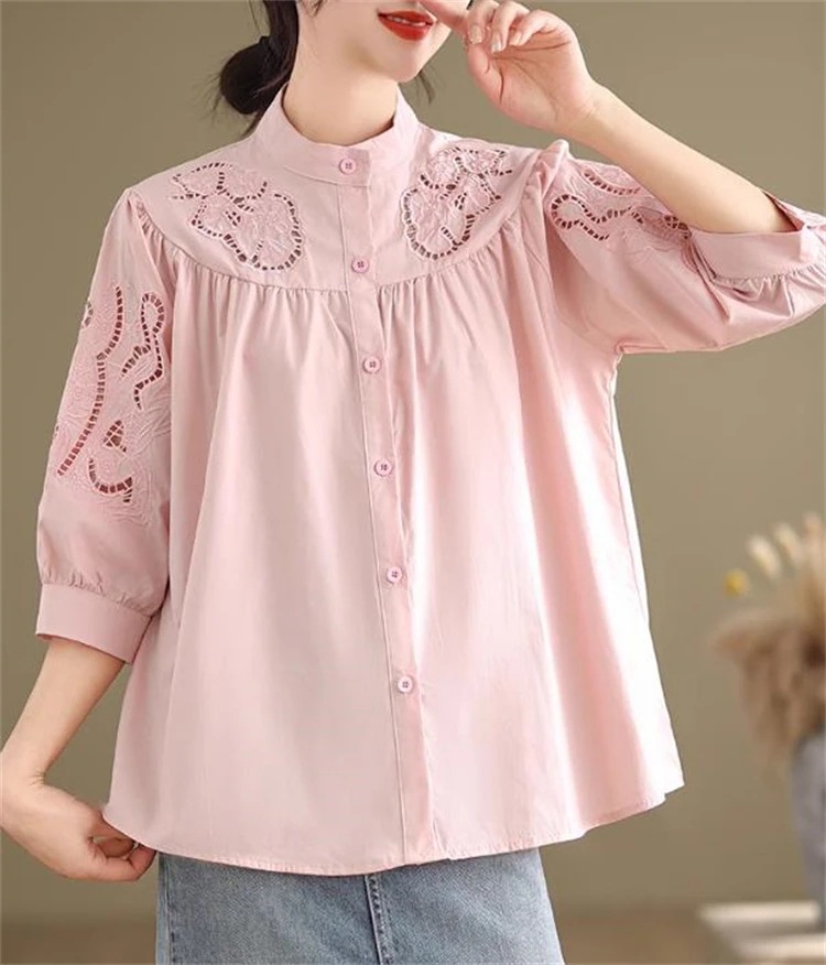 現代通勤する 大人可愛いデザイン 女性用たて衿刺繍シャツ 7分灯笼袖×ゆったりカット 2025年春ファッションアイテム