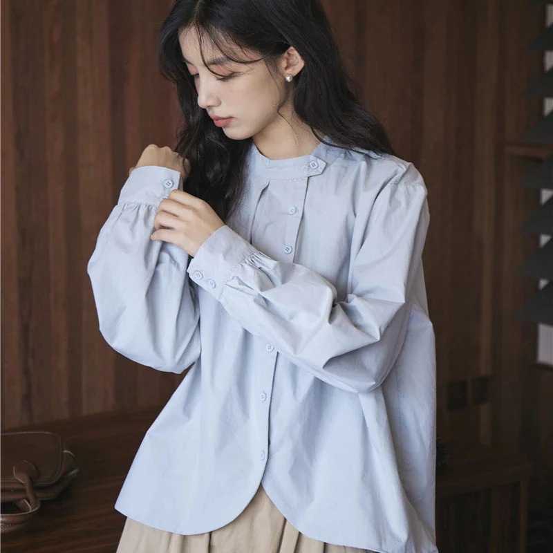 母の日秋の新型日系シンプル立襟長袖シャツ不規則なデザイン感純色シャツ上着女トップスシャツブラウス