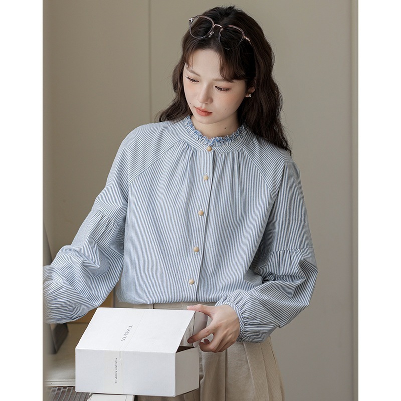 母の日秋冬の新型フランス文芸は丸首のひげ辺のデザイン感をつなぎ合わせてストライプの肩の袖の長袖のシャツの女性に落ちますトップスシャツブラウス