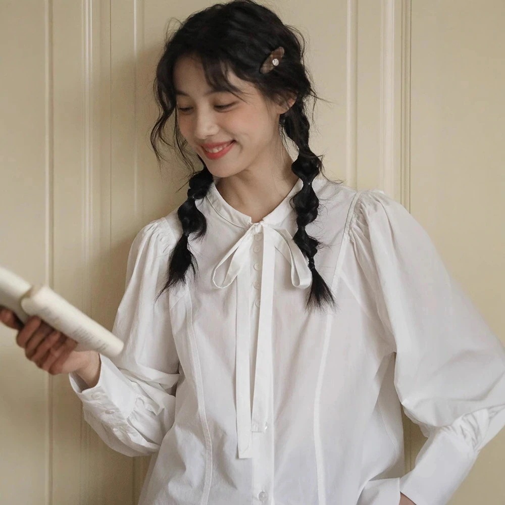 母の日2025春の新型日系フランス系リボン付き長袖シャツ女性灯籠袖底シャツトップスシャツブラウス