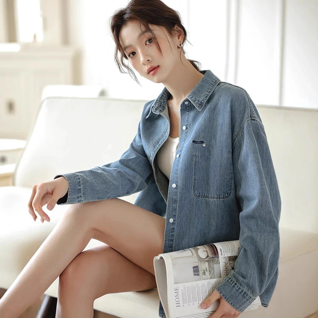 母の日版個性刺繍デニムシャツ女性2025春デザイン感レトロ長袖シック重ね着トップストップスシャツブラウス