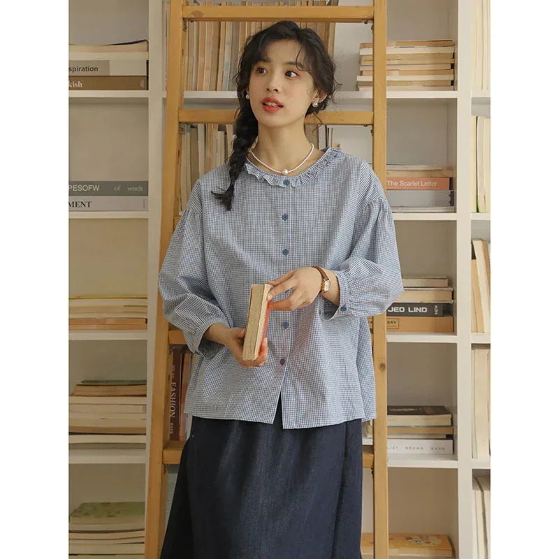 母の日2025春の新型文芸青白チェックシャツ女性長袖レース襟ゆるいカジュアルシャツ上着トップスシャツブラウス
