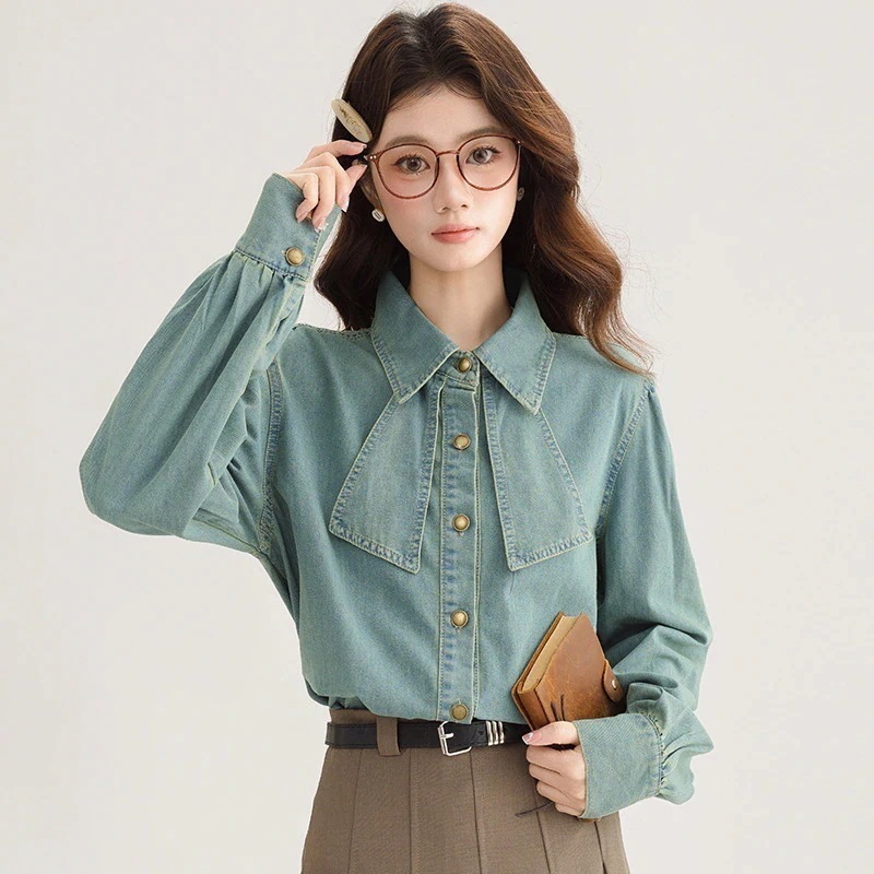 母の日2025春系ファッションレトロ水洗い蝶結び泡袖長袖デザイン感デニムシャツ女トップスシャツブラウス