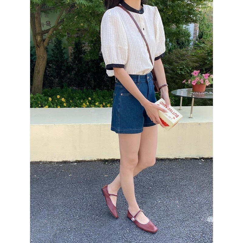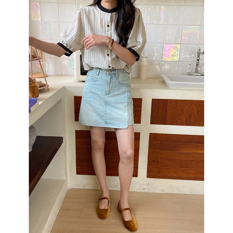 母の日リラックスした休日のデザイン感衝突色縞花茹袖立襟シャツ1860トップスシャツブラウス