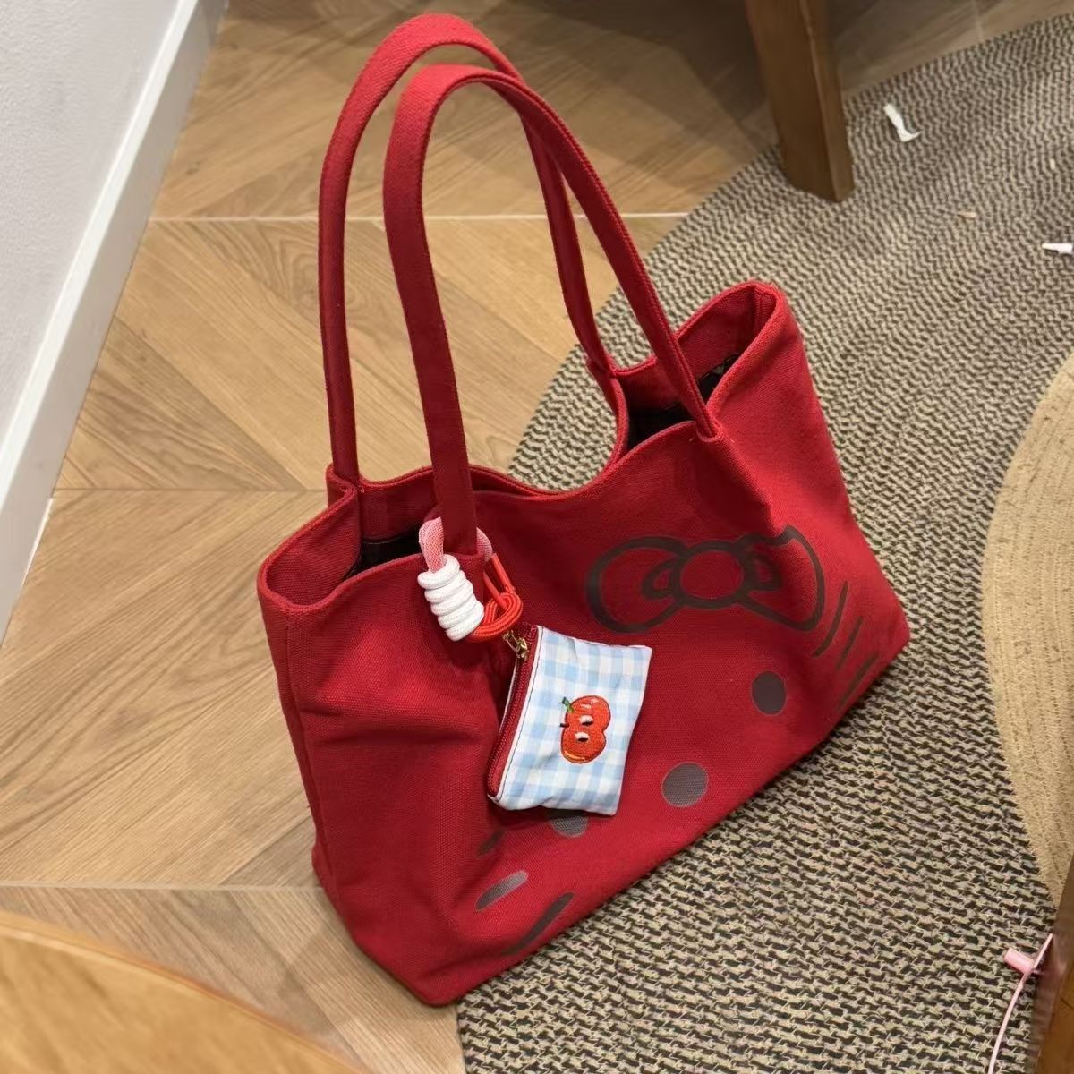大容量の新モデルのキャンバスバッグHello Kittyのトートバッグで可愛らしく学生にも適しています斜め掛けタイプでインスタ風シングルショルダーで持てるし手提げもできます通勤にも最適