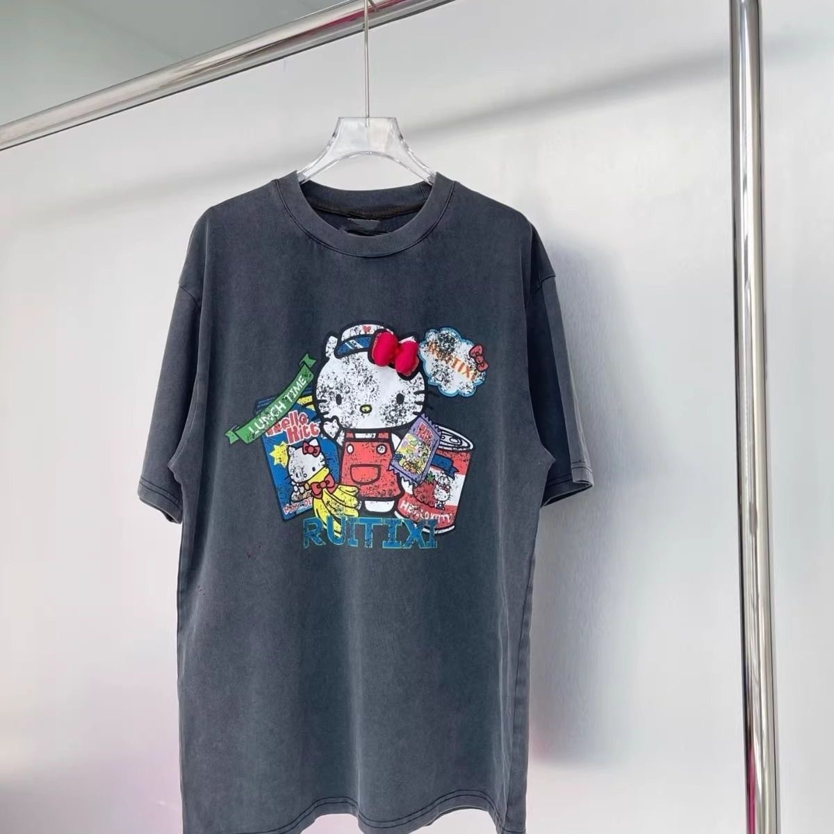 純綿アメリカンレトロ水洗い旧キティプリントデザイン半袖Tシャツ女2025夏ゆったり着やせトップス誕生日プレゼント女の子親友カップル男女