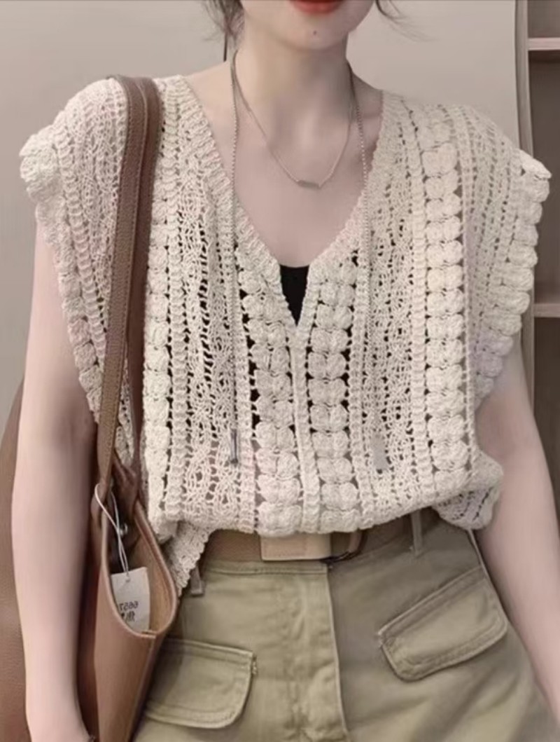 Vネックかぎ編みニットベスト レディース ノースリーブサマートップス