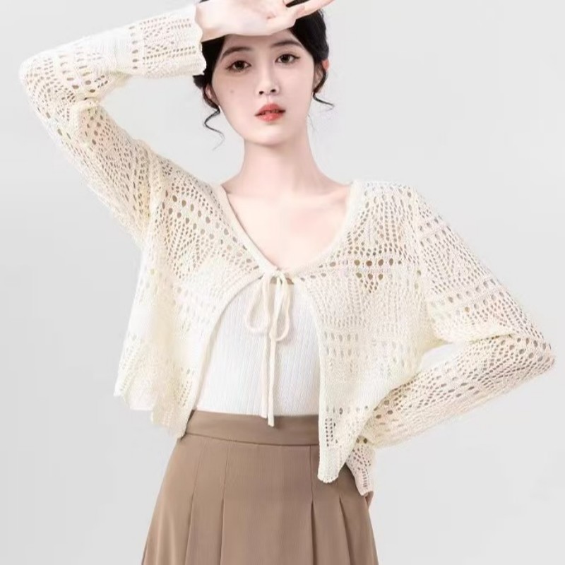 透かし編みリネンニットカーディガン レディース 長袖サマーボレロ