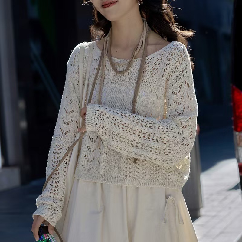 アイボリー透かし編みニットトップス レディース 春夏韓系上衣