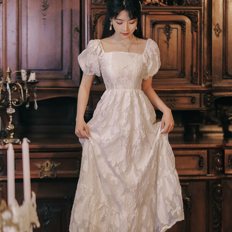 スクエアネックワンピース 夏新作 ハイウエスト パフスリーブ ロングドレス フレンチ ファッション パーティードレス