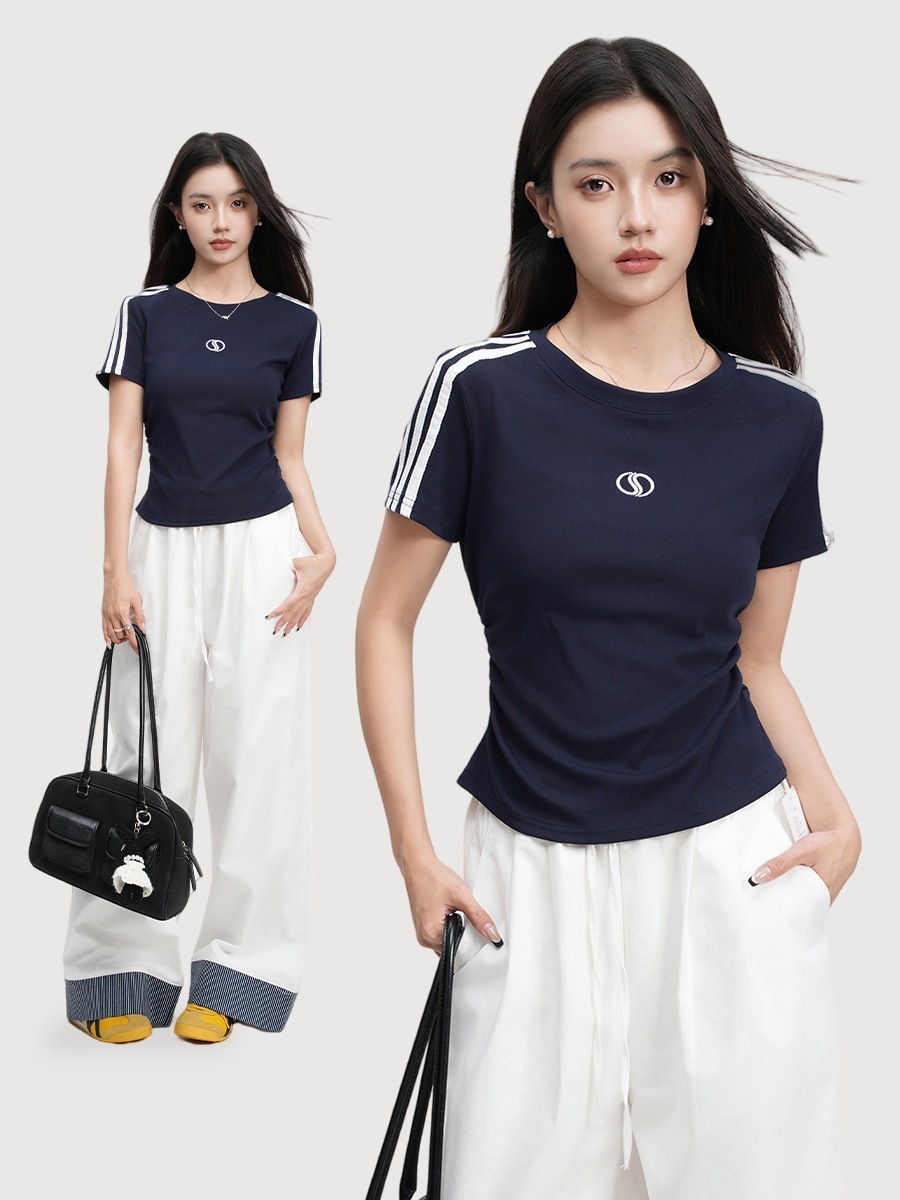 2025春夏 アメリカンスタイル トップス Tシャツ 半袖 3本ラインストライプ 正肩 刺繍 ウエストシェイプTシャツ レディース デザイナーズ