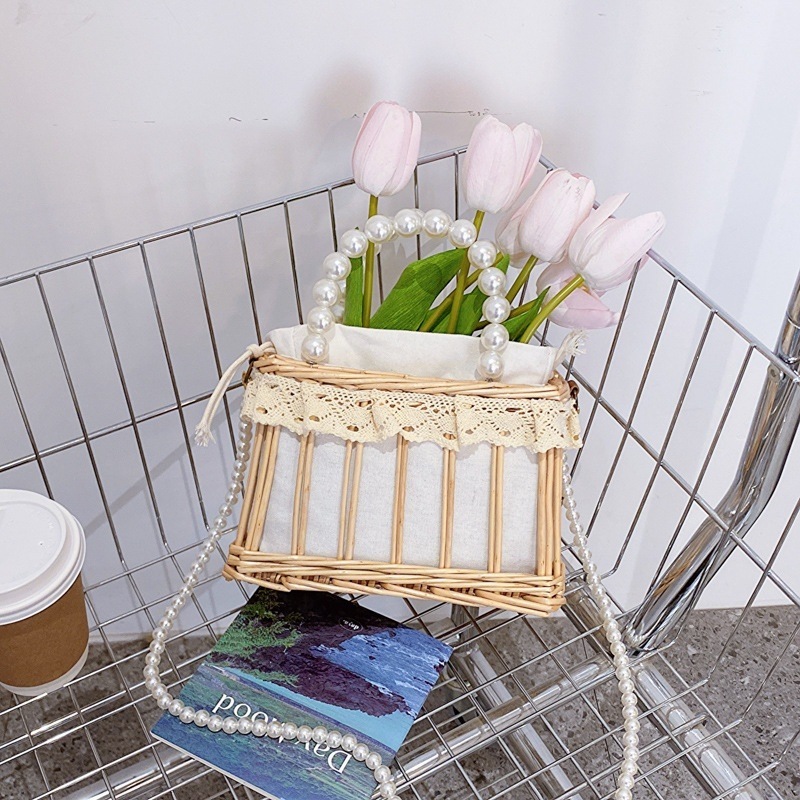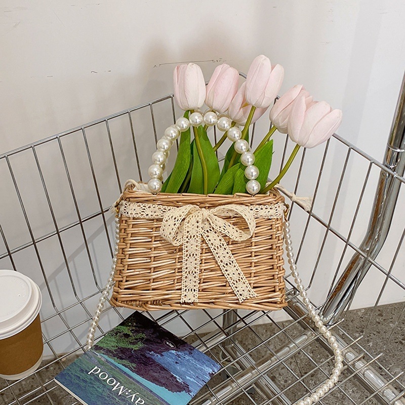 韓国 かごバッグ 大容量 籠バッグ パール ショルダーバッグ タテ型 リボン レディース 大きめ かわいい おしゃれ 編みバッグ ビーチバッグ 浴衣かごバッグ