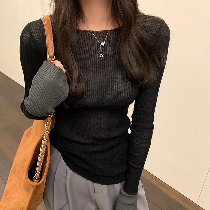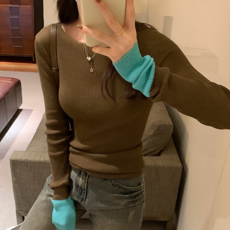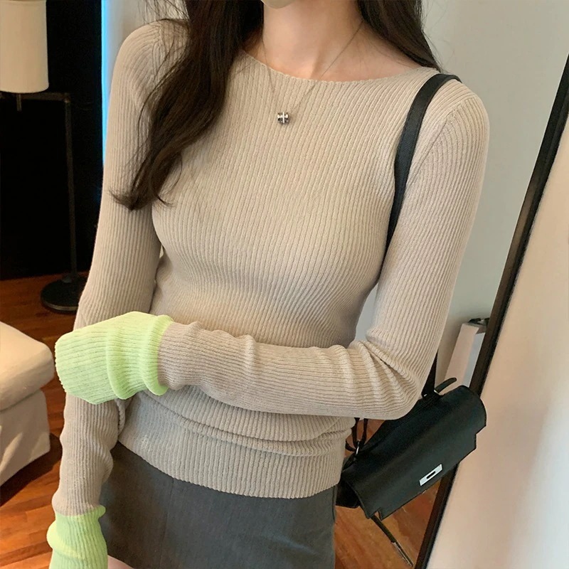 韓国風ラウンドネックシックな袖コントラストニットセーターレディース秋冬新作スリムフィットインナーレイヤリングシャツ 母の日 母の日-0002000