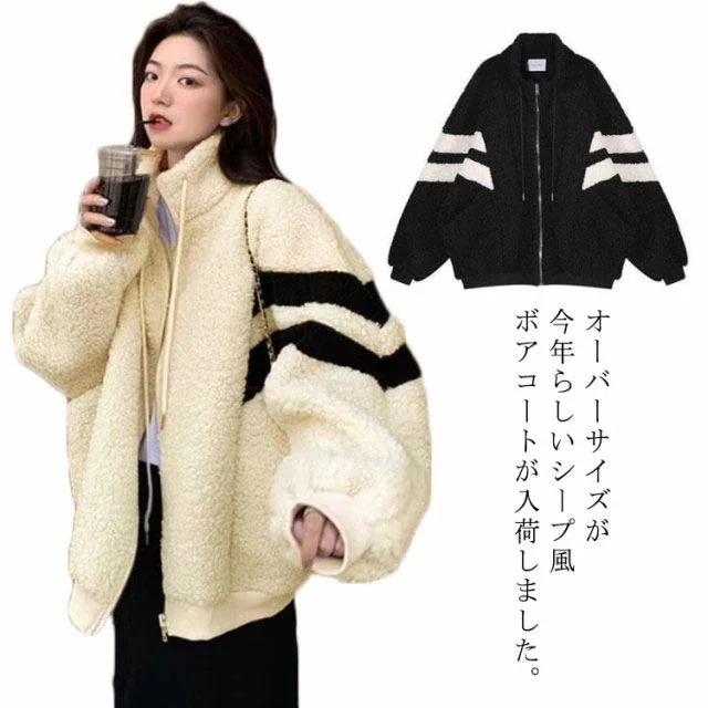 もこもこ アウター ボアコート レディース 黒 冬 ゆったり スタンドカラー カジュアル ブルゾン ドロップショルダー 暖かい フリースジャケット ボアジャケット 秋冬 防寒 ベージュ オーバーサイズ