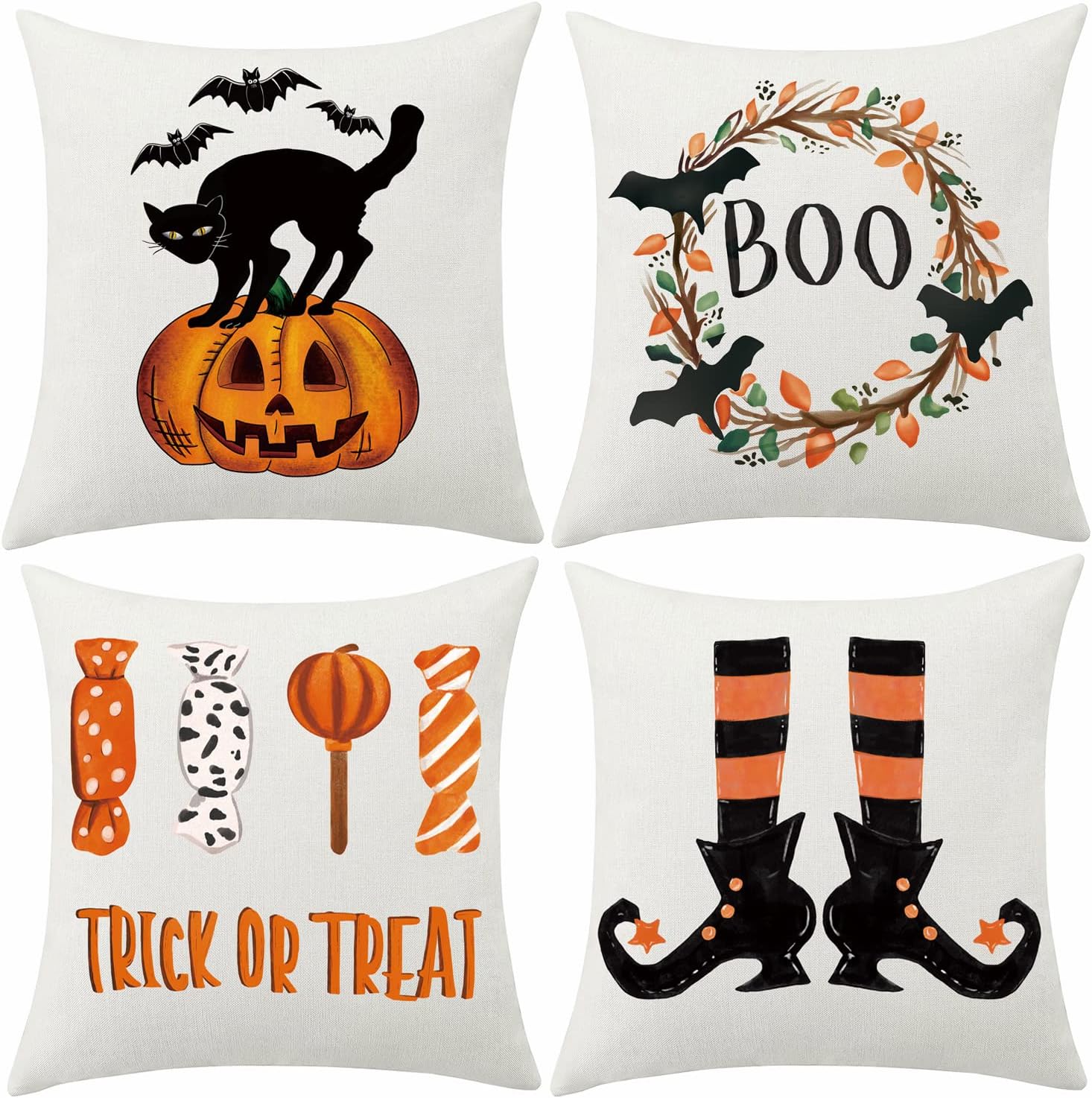 ハロウィンクッションカバー 18x18インチ 4枚セット ブーキャット パンプキン トリックオアトリート スローピロークッションケース カウチ ファームハウス アウトドア ハロウィン装飾 両面パターン
