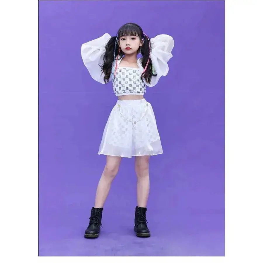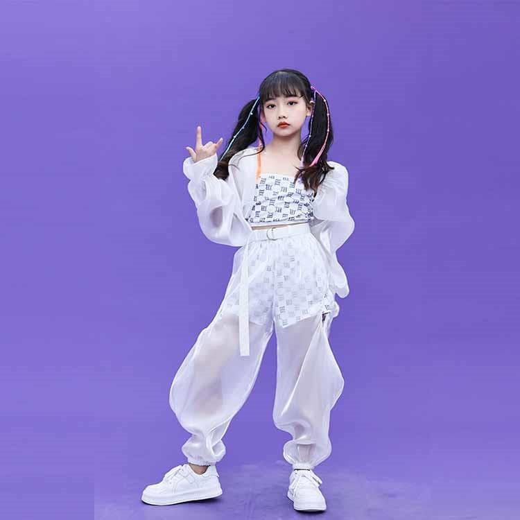掲載白 キッズダンス 衣装 セットアップ シースルー 肌見え へそ出し スカート パンツ 子供服 ヒップホップ 女の子 モノトーン チアガール 応援団 発表会