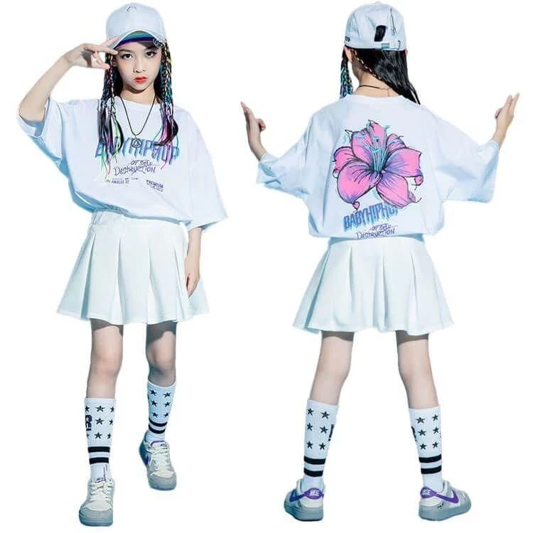 大人气2枚購入で 2oo円FF!風格が独特キッズダンス衣装 ヒップホップ 女の子 キッズ衣装 チアガール ストリート ホワイトスカート チームお揃い スポーツウェア 体操服 団体演出 ahiphop