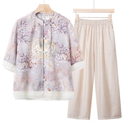 チャイナ風 半袖シャツ ブラウス ロングパンツ 上下セット 太極拳服 夏 大人用 唐服 漢服 写真撮影 チャイナ服 中華風 ヨガ服 レッスン着 ゆったり 大きいサイズ 日常着 普段着 30代40代50